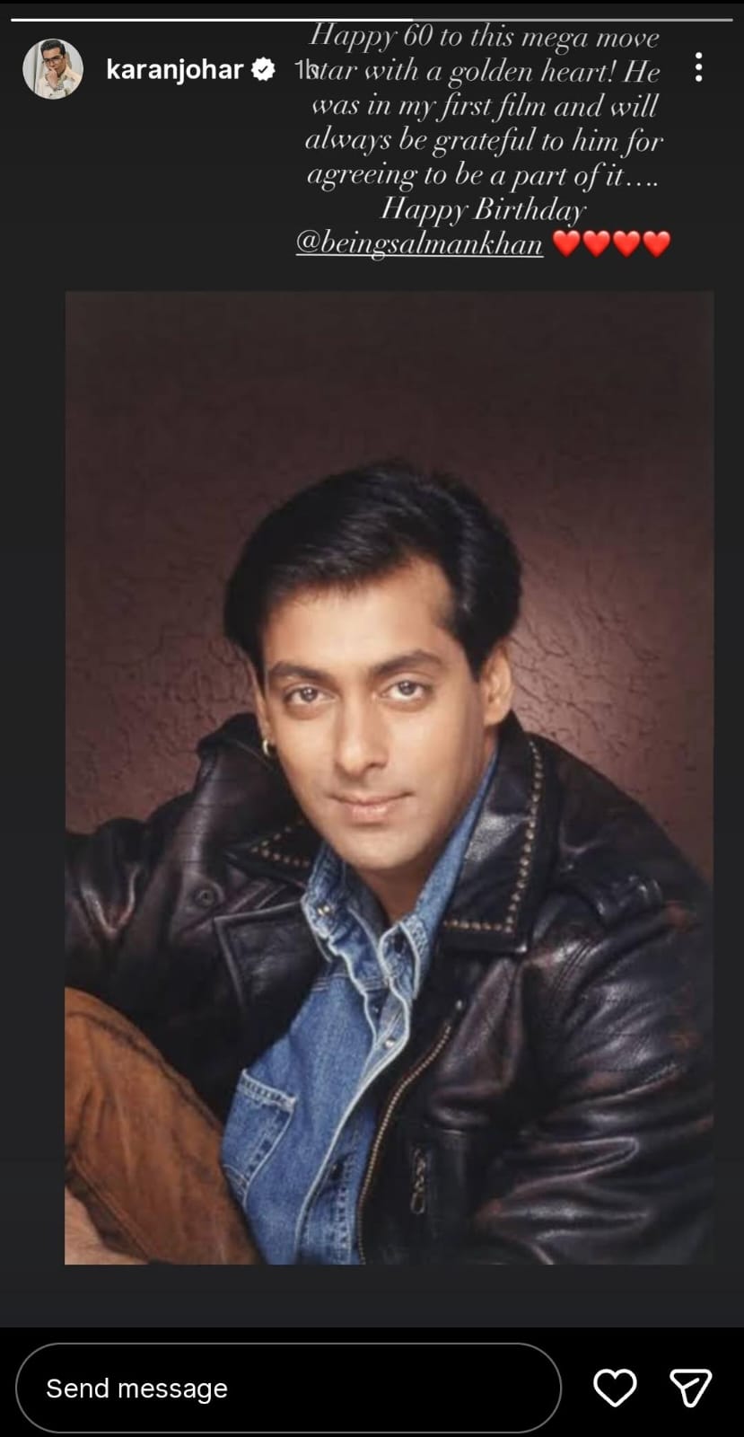 Karan Johar took to his Instagram stories to share a major throwback picture of Salman Khan. In his caption, he wrote that he will forever be grateful to Salman for agreeing to be a part of his directorial debut Kuch Kuch Hota Hai. “Happy 60 to this mega movie star with a golden heart! He was in my first film and will always be grateful to him for agreeing to be a part of it… happy Birthday @beingsalmankhan.” Check out his story below!