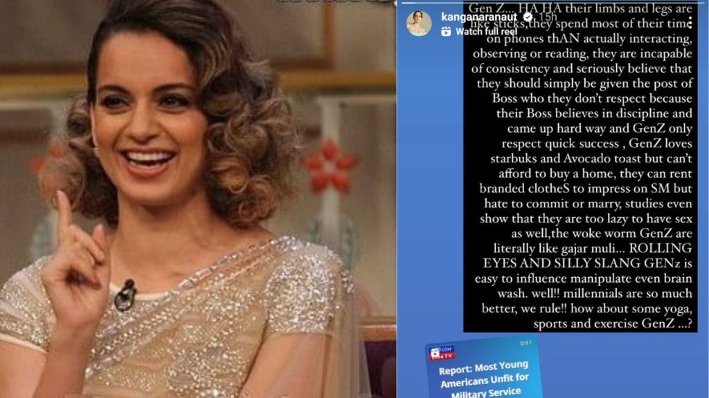 Kangana Ranaut wrote a critique of GenZ (born between 1997 and 2012). According to kangana They always are obsessed with their phones, couldn’t afford a house, and even weak in commitments and relation. She also encouraged them to do yoga and exercise, saying they are too lazy to have sex.